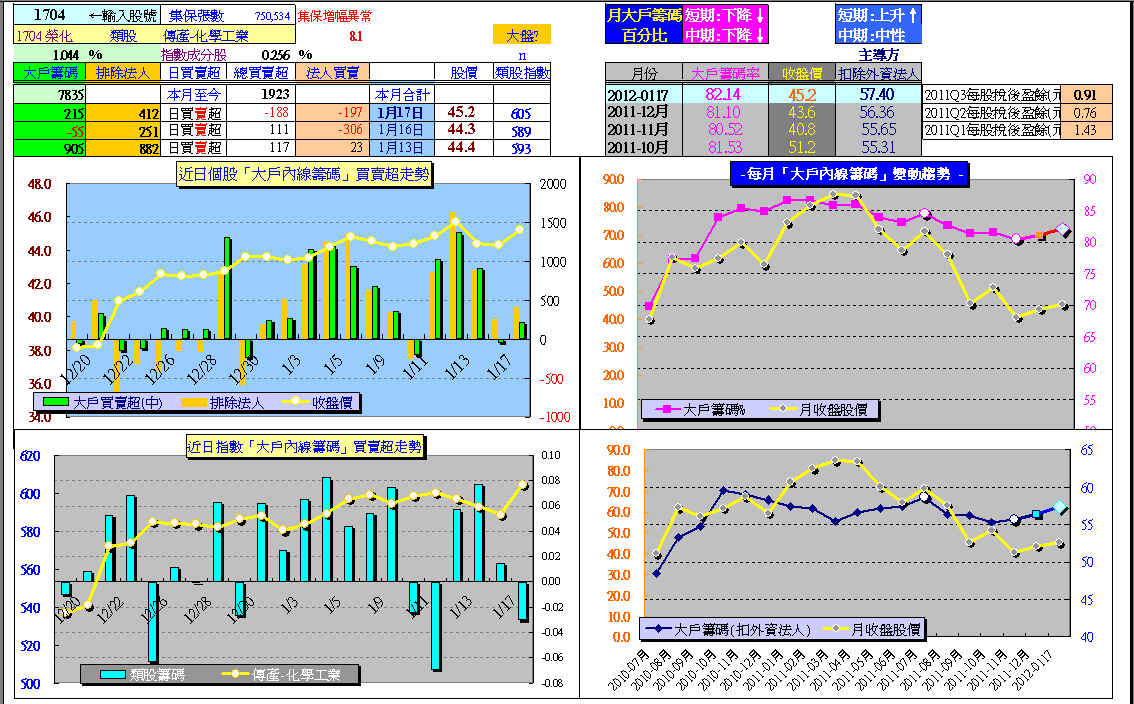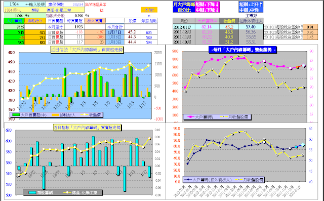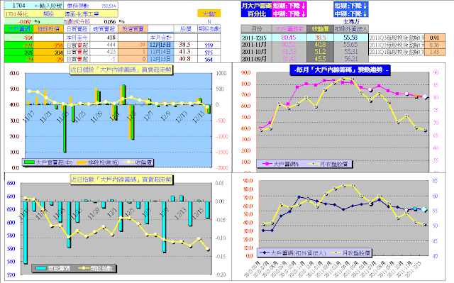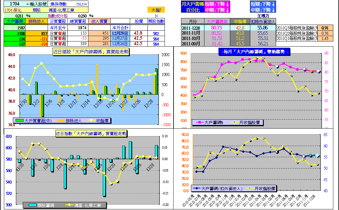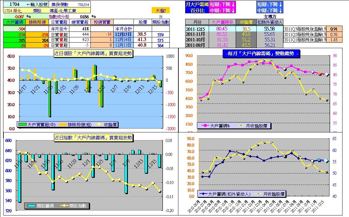 2011年第三季末,就開始注意節能概念股,「榮化」1704因為個股「大戶內線籌碼」指標顯示,長線大戶主力(公司派)並沒有大幅減碼(相較其他太陽能股票尤其籌碼穩定),因此成為密切追蹤關注目標。