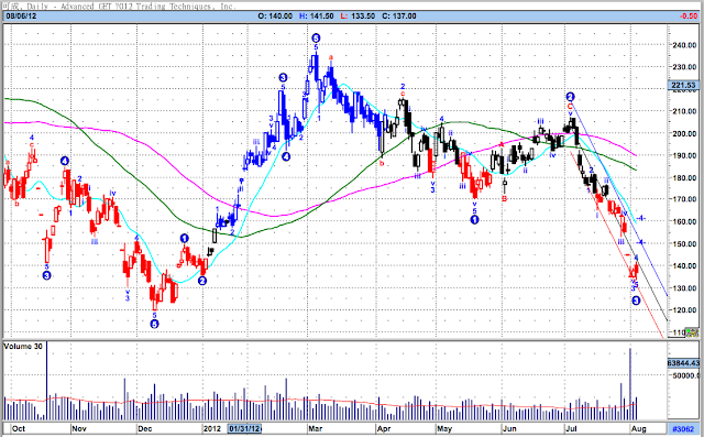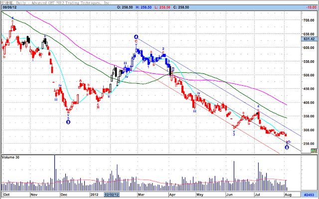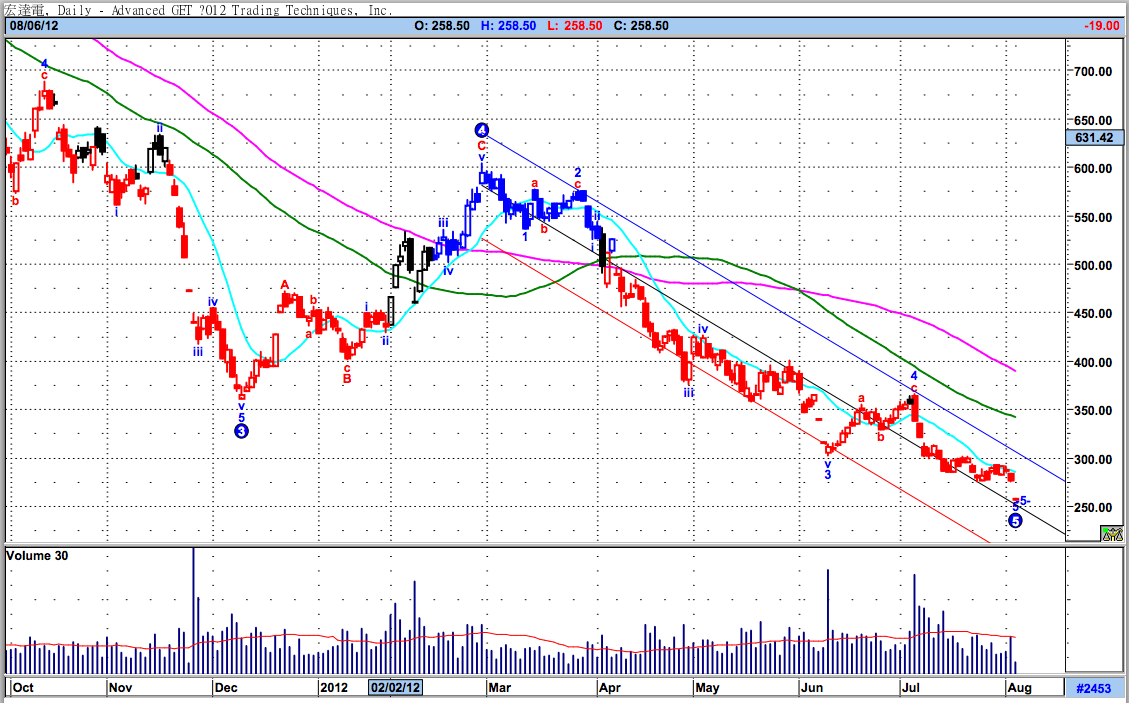 (例二)如下圖2498c宏達電於2012年三月第4大波反彈完後,於四月初K線由藍色變成紅色,顯示趨勢轉空,出現一路大跌,至八月初已下跌超過200元,未來何時K線由紅色變成黑色,下跌趨勢才可能改變: