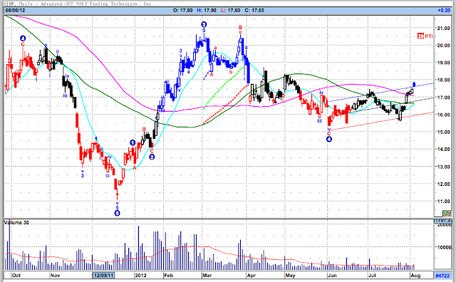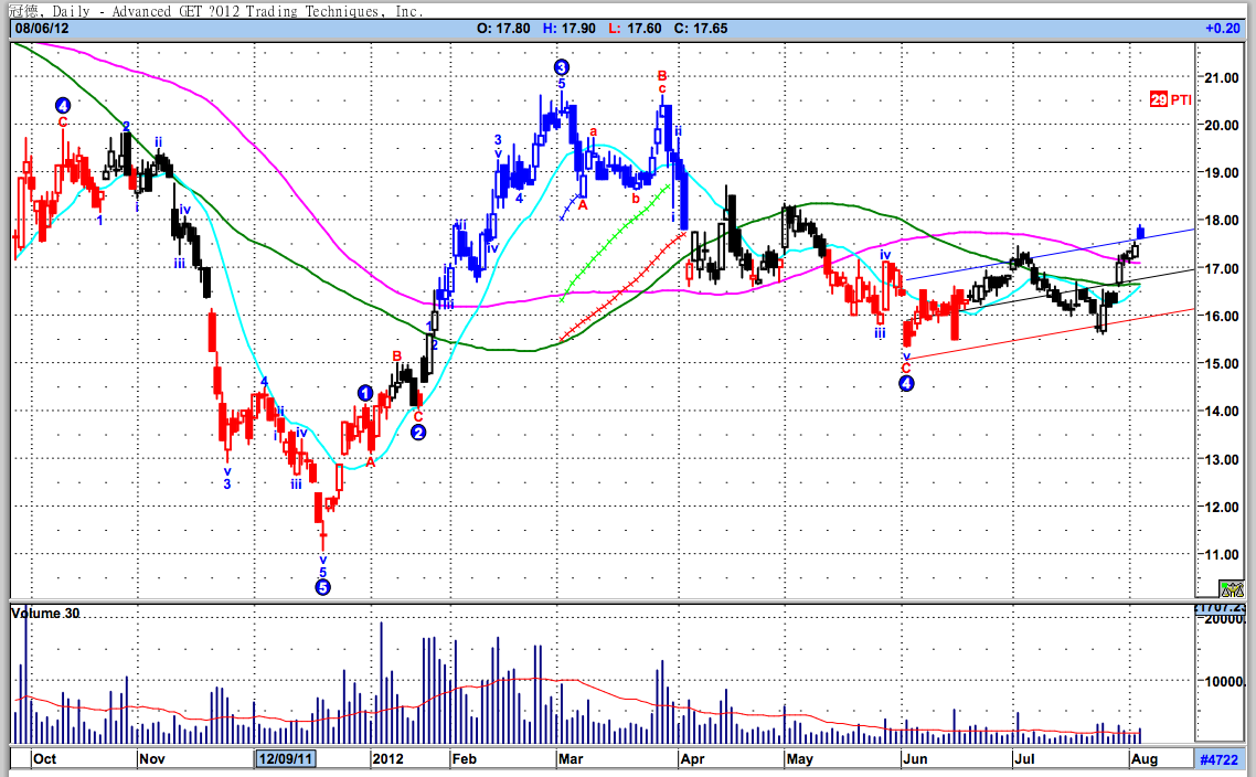 (例一)如下圖2905三商行於2012年三月,第4大波反彈完後,於3月初K線由藍色變成黑色,暗示趨勢可能改變,而又於3月底K線由黑色變成紅色,顯示趨勢轉空,之後大幅波段下跌展開,直至7月初,K線由紅色變成黑色,下跌趨勢得以出現扭轉契機,7月中,K線由黑色變成藍色,趨勢翻多後出現大漲: