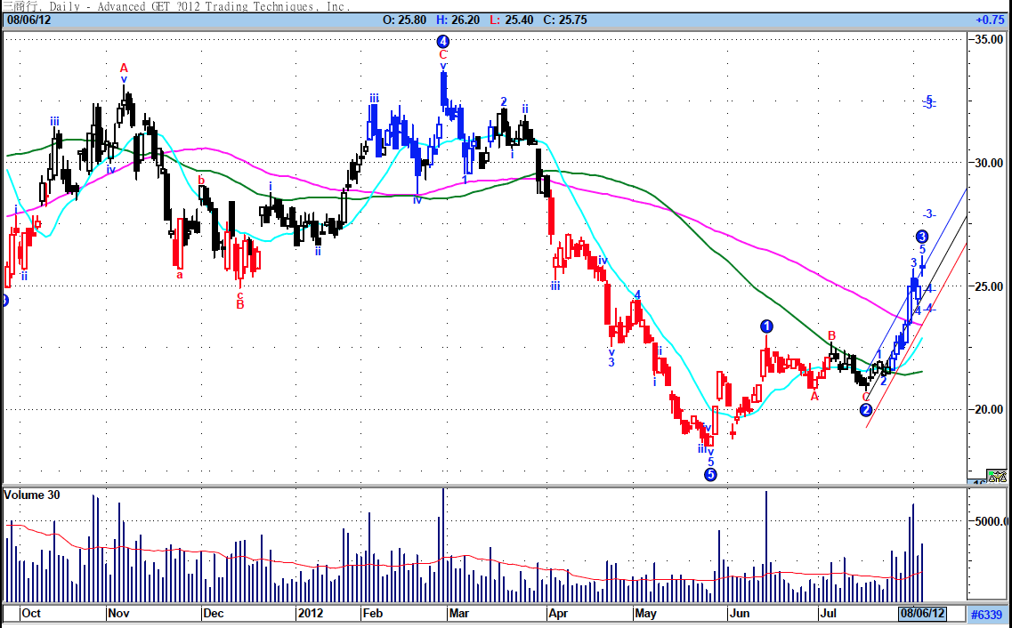 (例二)如下圖,2905三商行目前是向上第三波,因此適合看多操作之規劃: