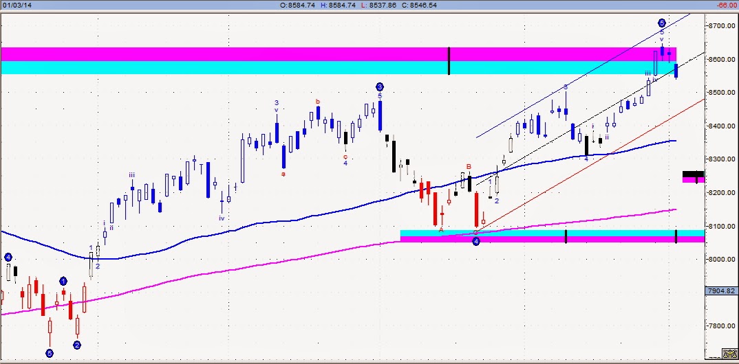 大盤日線波浪圖來看,上檔鐵板壓力帶8550-8640點可謂相當的粗勇,顯見這邊的壓力是相當的大,所以很久很久以前,筆者就看圖說故事的提示大盤高點就是八跟六,剛好命中大盤上週高點8647點,試問,全市場有哪個軟體可以在大半年前就點出八跟六的壓力相當重,更甚為近日報紙都寫元月行情,多家機構都預測大盤要漲到9字頭了,你又被報紙騙了嗎?哈哈!