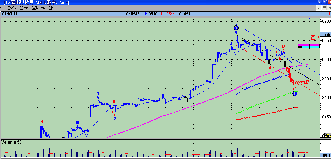 再從下圖的台指期分時波浪圖來看(請看清楚,是§ 1-4的下圖),目前為第4小波拉回,但PTI只有54,代表未來的第5小波過高點機率不是很高,則短線看法是高檔盤整,農曆年後得提防較大的回檔修正。