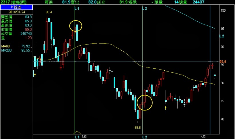 回想到2012年12月初,這天鴻海公佈前一月營收,真是好到破表,當天報紙一堆鴻海利多,多家財經機構上調目標價,130、150元都有人喊,但,看看K線圖就知道,鴻海股價自當時96元高點往下跌,一路跌到68.8元的吉利數字。從鴻海的大戶籌碼圖表可追蹤到,集中度自86%(L1)降到78%(L2),8%,換算鴻海股本,等於主力大戶一路賣出113萬張,套一句廣告台詞--你累了嗎?(你被騙了嗎?)