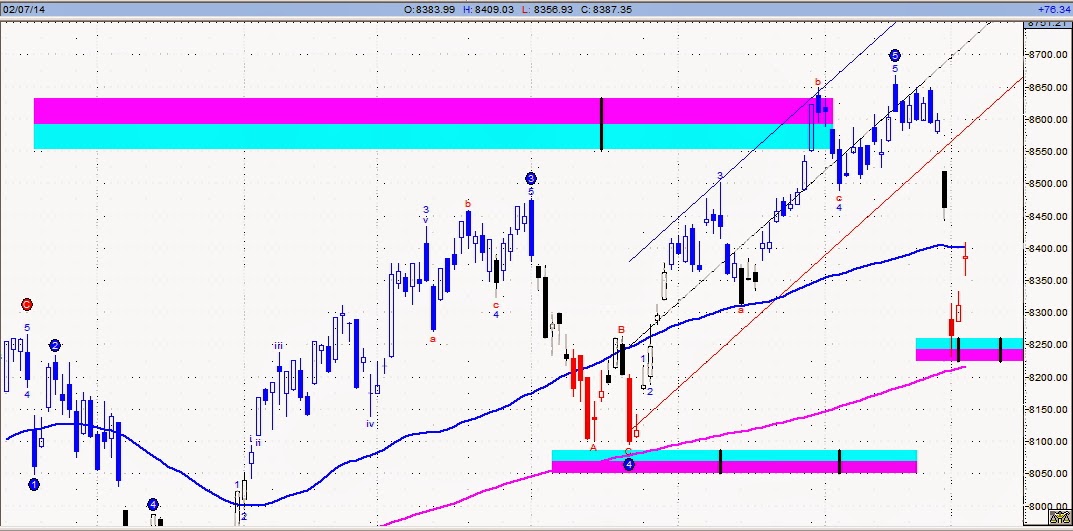 大盤波浪第5波上漲碰觸鐵板壓力帶後拉回,並已跌破上升軌道區間,技術面已出現ABC波修正,且5波上漲時間相當長,修正的時間波恐怕不是短時間就結束,而自動波浪程式具參考性的價值,比如近來突然大跌,跌到哪?波浪就有一條短線支撐帶在8230點左右,是不是碰到就出現200多點的反彈。