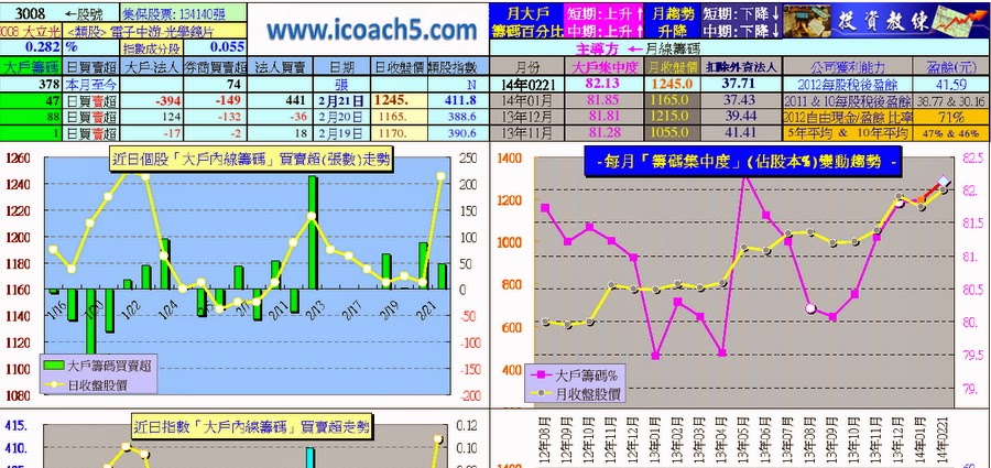 比較之下,大立光集中度連續5個月增加約2%強,股價也隨之創高坐穩股王寶座,而挑戰者是〝台積電吃很大〞的漢微科,集中度是前2個月破近期新低的短線背離型態,所以,本期冠軍是...大立光。