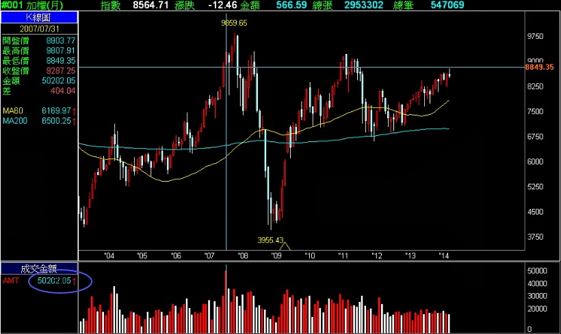 台股自2000年的網路泡沫破滅高點10393點,已經整整14年摸不到萬點的邊,就算每年都喊萬點萬點也一樣,原因之一其實就是政治面你拉我扯有夠亂,就當做是大家不夠努力吧。以科學的統計角度即知,去年初就喊台股只會到八跟六是有其所以然,2007年金融海嘯在8800點之上套了5兆資金,如此基本面要往上突破,甚至上攻萬點,難!