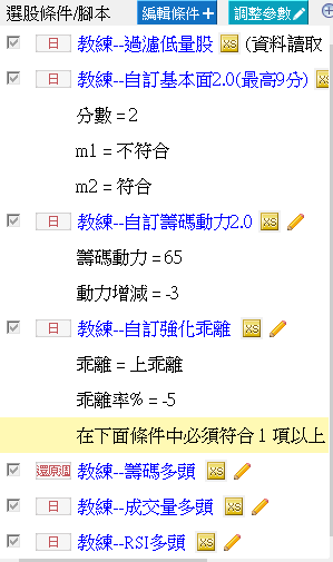 先把條件下限設定好,基本面與籌碼動力不能低於標準(自訂參數),短線也不能有超漲的現象,