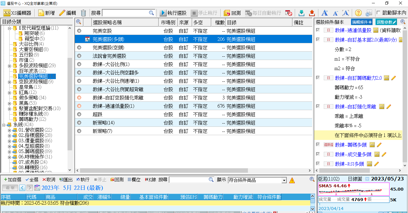 再加上三大多空指標不能都是空頭,如此就設定好自己想要的選股池--完美選股模組。