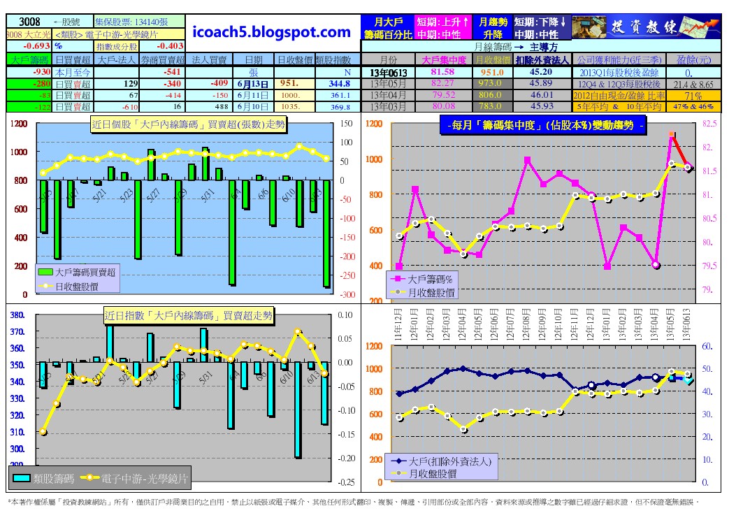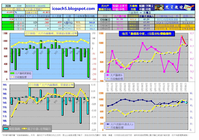 在此說明,分享版試看網站http://icoach5.blogspot.com的資料會delay〝底類〞若干天(以維護付費會員權益),1300多檔股票跟大盤整合的大戶進出動向,跟日線波浪走勢圖,都可以隨時查詢參考,平均一檔一個月不到1塊錢,簡直是太划算了。