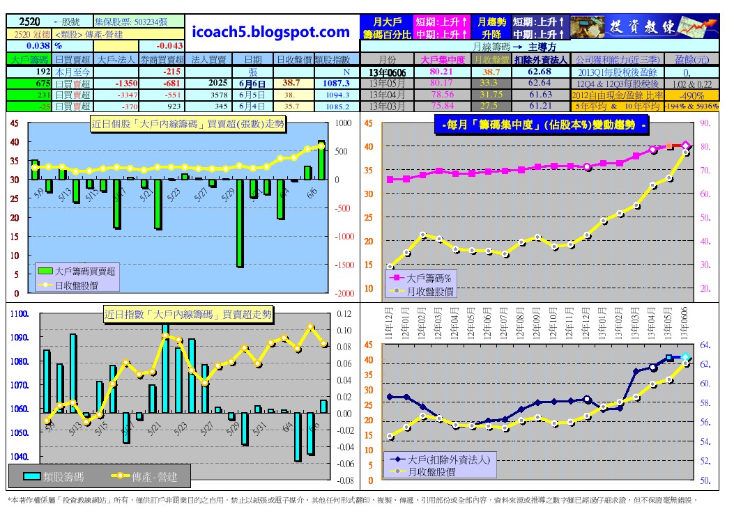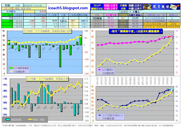 在此說明,分享版試看網站http://icoach5.blogspot.com的資料會delay〝底類〞若干天(以維護付費會員權益),1300多檔股票跟大盤整合的大戶進出動向,跟日線波浪走勢圖,都可以隨時查詢參考,平均一檔一個月不到1塊錢,簡直是太划算了。
