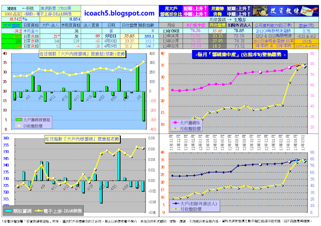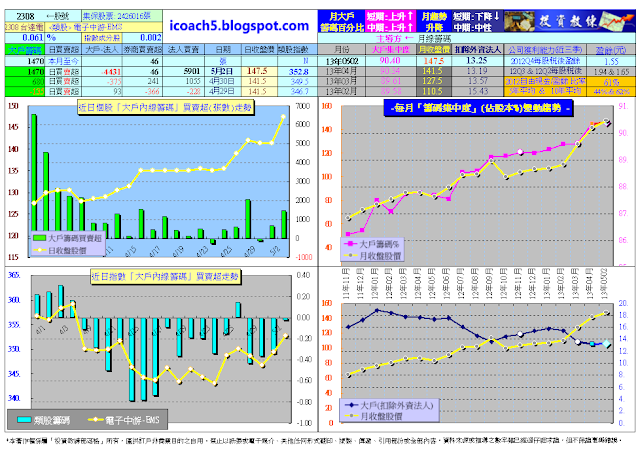 在此說明,分享版試看網站http://icoach5.blogspot.com的資料會delay〝底類〞若干天(以維護付費會員權益),1300多檔股票跟大盤整合的大戶進出動向,跟日線波浪走勢圖,都可以隨時查詢參考,平均一檔一個月不到1塊錢,簡直是太划算了。