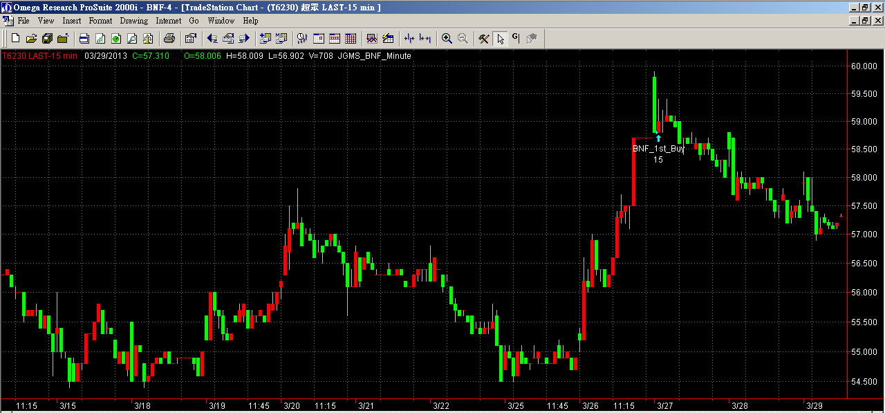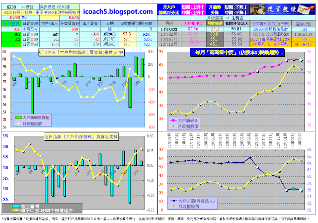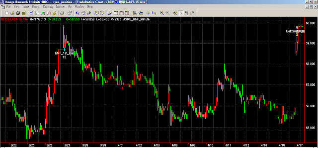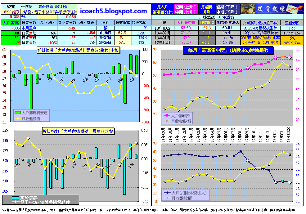 ★前日3/27日,投資教練的盤中即時高勝率BNF交易模組訊號,6230超眾在當日盤中09:30左右發出買進訊號(進場股價58.8元,目前57.2元),該股目前在「聚寶盆籌碼智慧選股」看多模組排名上升,因此引起注意,未來或許仍會有波段反彈機會,可以過去程式交易績效表現,作為未來是否進場搶反彈的時機參考,以下請參考「BNF高勝率交易模組個股分析報告6230新單買進-20130329」之內容。
