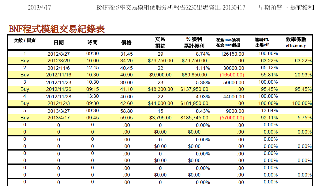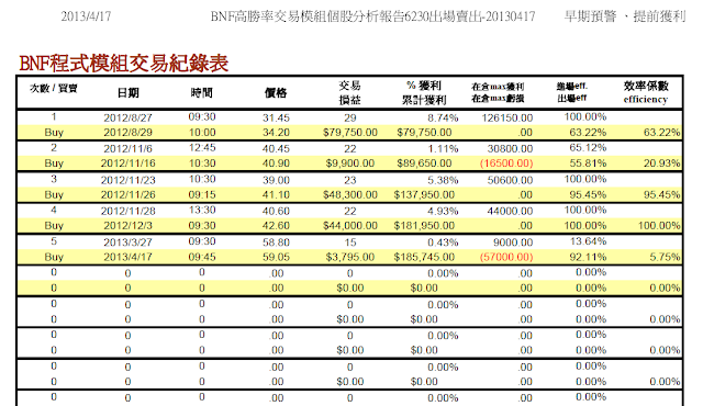 (原進場訊號之報告為 BNF高勝率交易模組個股分析報告6230新單買進-20130329 )