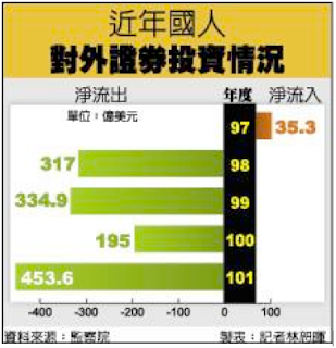 看看這張圖表,去年淨流出453億美金,從整體大戶籌碼就能看到去年主力大戶幾乎都在大賣小賣,出場後就沒再回來,今年同期成交量大減37%,可知證所稅的殺傷力有多大,課稅是〝奇摩子〞不爽的小事,最大的影響是大戶都有用人頭戶操作,一旦課稅,大戶的資金流向會被國稅局盯上,到時被查的稅可不是千分之2這麼小條,所以此法要上路,大戶們有志一同的就〝勞跑〞了,看到本週監察院提出這一點來〝糾正〞相關單位,真是大快人心,但…流出去的資金已經回不去了…><