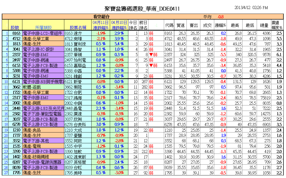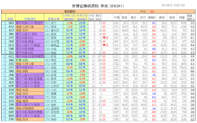 4/12日收盤之「聚寶盆籌碼智慧選股」看多模組EXCEL即時連結畫面: 投資教練的聚寶盆智慧選股模組,與「大戶內線籌碼」監控表,加上智慧型日線波浪走勢圖,就是成就你波段操作常勝軍的保證。