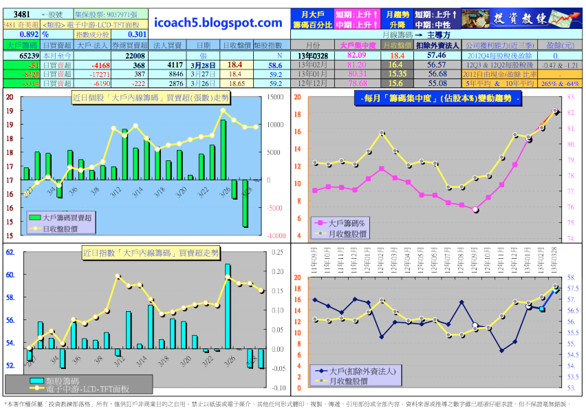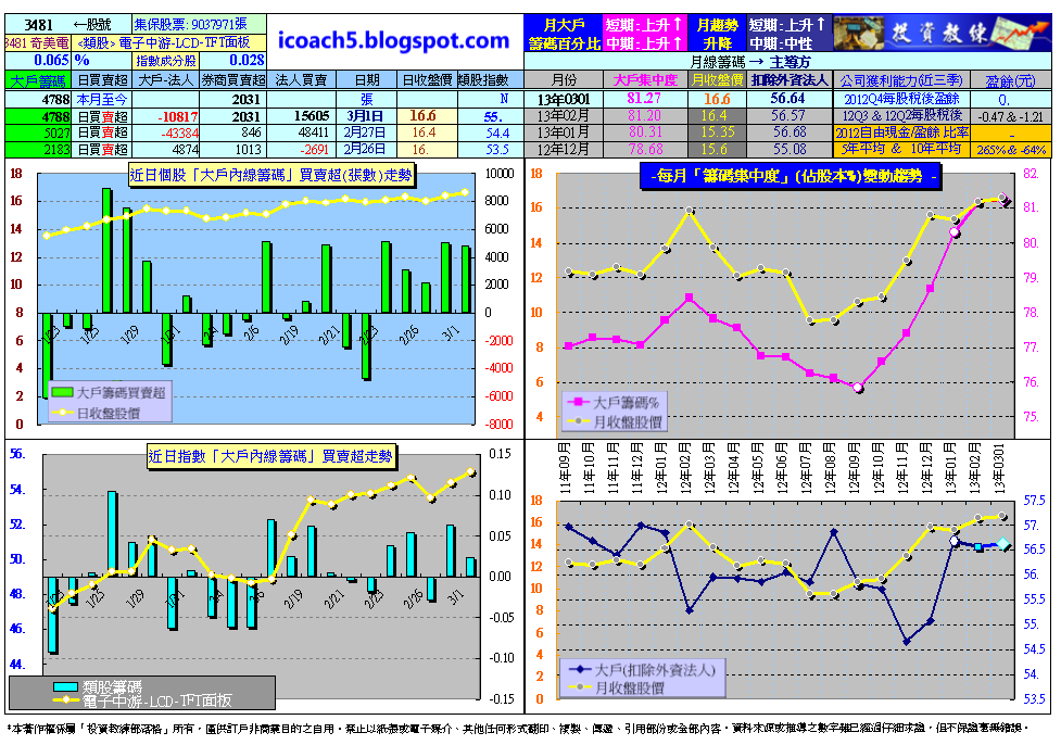 3/1日收盤奇美電「大戶內線籌碼」監控表: 要能夠早期發現,並追蹤鎖定一檔好股票,跟進抱牢一個波段,其實真的並不容易,看到下方的奇美電日線波浪走勢圖,當然很多人都可以如法炮製,找一檔飆股來事後諸葛亮一番,說自己早就料到它會大漲如何如何,但重點是你能不能早期發現,並且抱牢,又要如何研判它是否還有動力向上,或是你怎麼知道,自己買的股票,會不會像去年的2498宏達電一樣從高點腰斬再腰斬?