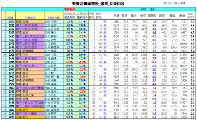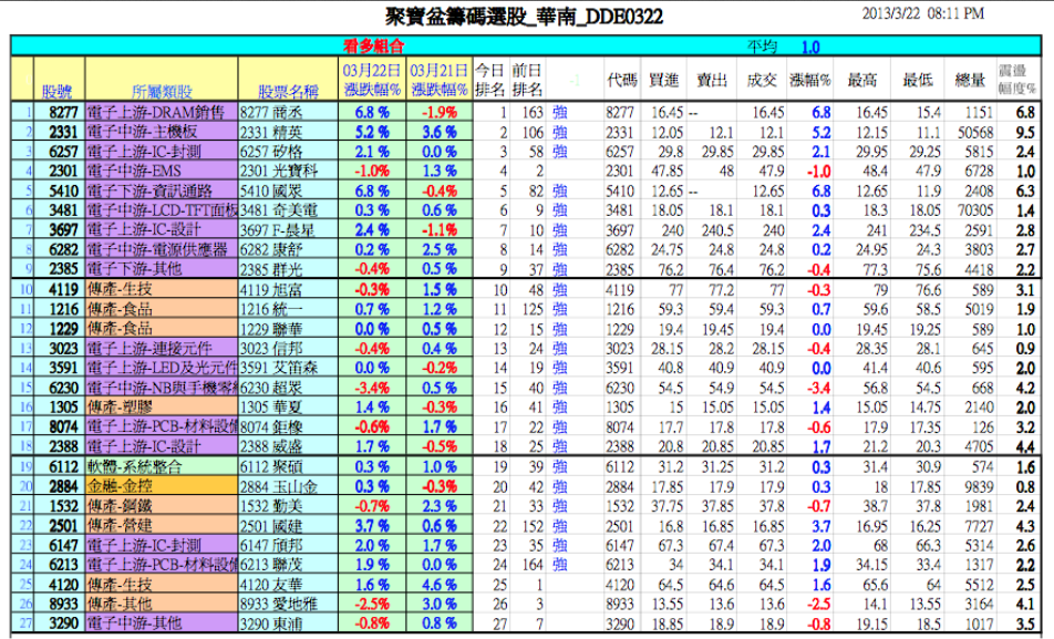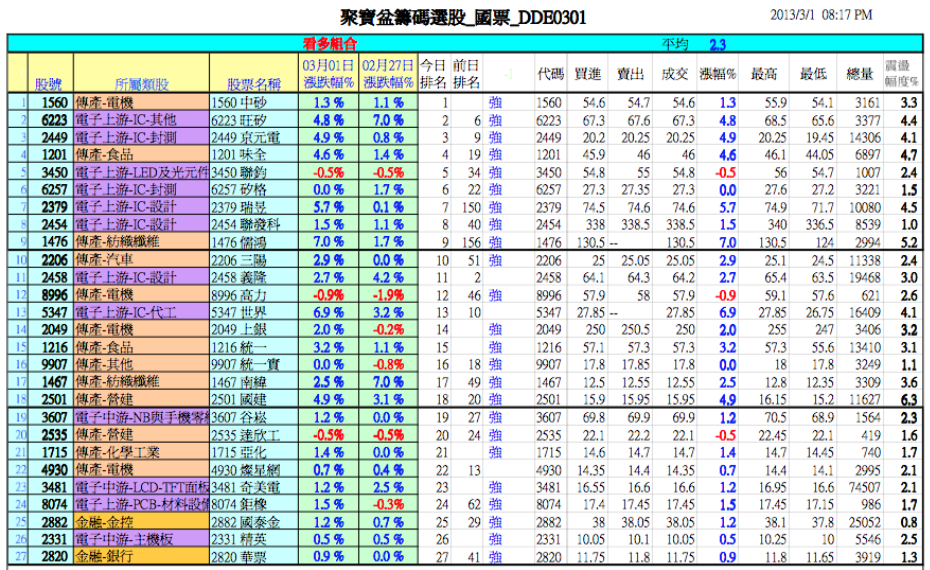 3/1日收盤之「聚寶盆籌碼智慧選股」看多模組EXCEL即時連結畫面(奇美電第23名):