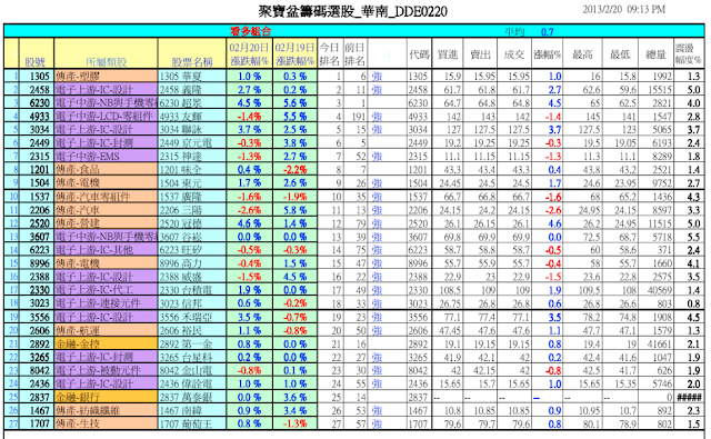 2013年2/20日收盤聚寶盆智慧選股模組看多組合:(葡萄王第27名)