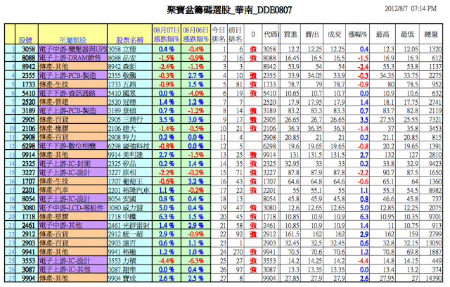 2012年8/7日收盤聚寶盆智慧選股模組看多組合:(葡萄王第16名)