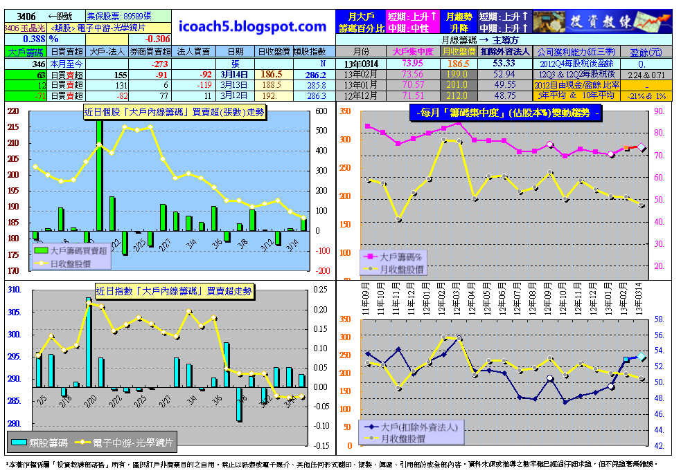 3/14日收盤玉晶光「大戶內線籌碼」監控表: