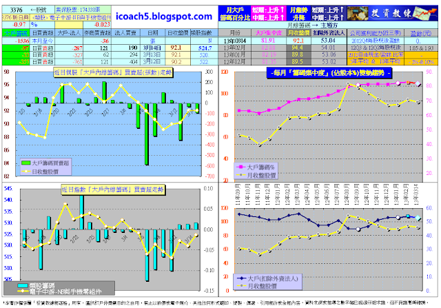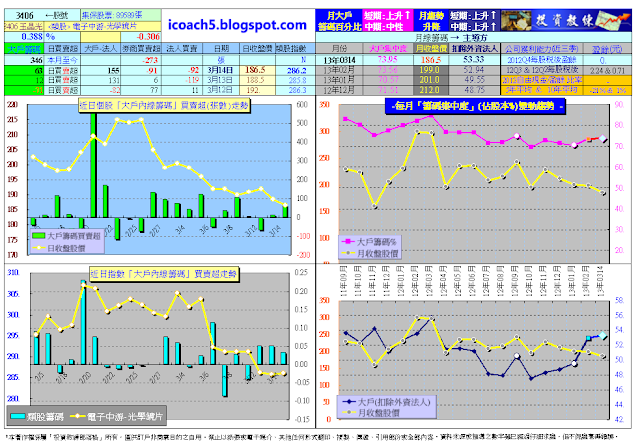 在此說明,分享版試看網站http://icoach5.blogspot.com的資料會delay〝底類〞若干天(以維護付費會員權益),1300多檔股票跟大盤整合的大戶進出動向,跟日線波浪走勢圖,都可以隨時查詢參考,平均一檔一個月不到1塊錢,簡直是太划算了。