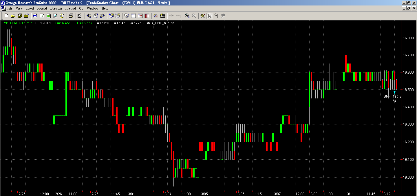 ★今日3/12日,投資教練的盤中即時高勝率BNF交易模組訊號,2913農林在當日盤中10:45左右發出買進訊號(進場股價16.6元,目前16.45元),該股目前在「聚寶盆籌碼智慧選股」看多模組排名上升,因此引起注意,未來或許仍會有波段反彈機會,可以過去程式交易績效表現,以及個人技術分析之綜合研判,作為未來是否進場搶反彈的時機參考,以下請參考「BNF高勝率交易模組個股分析報告2913新單買進-20130312」之內容。