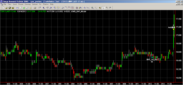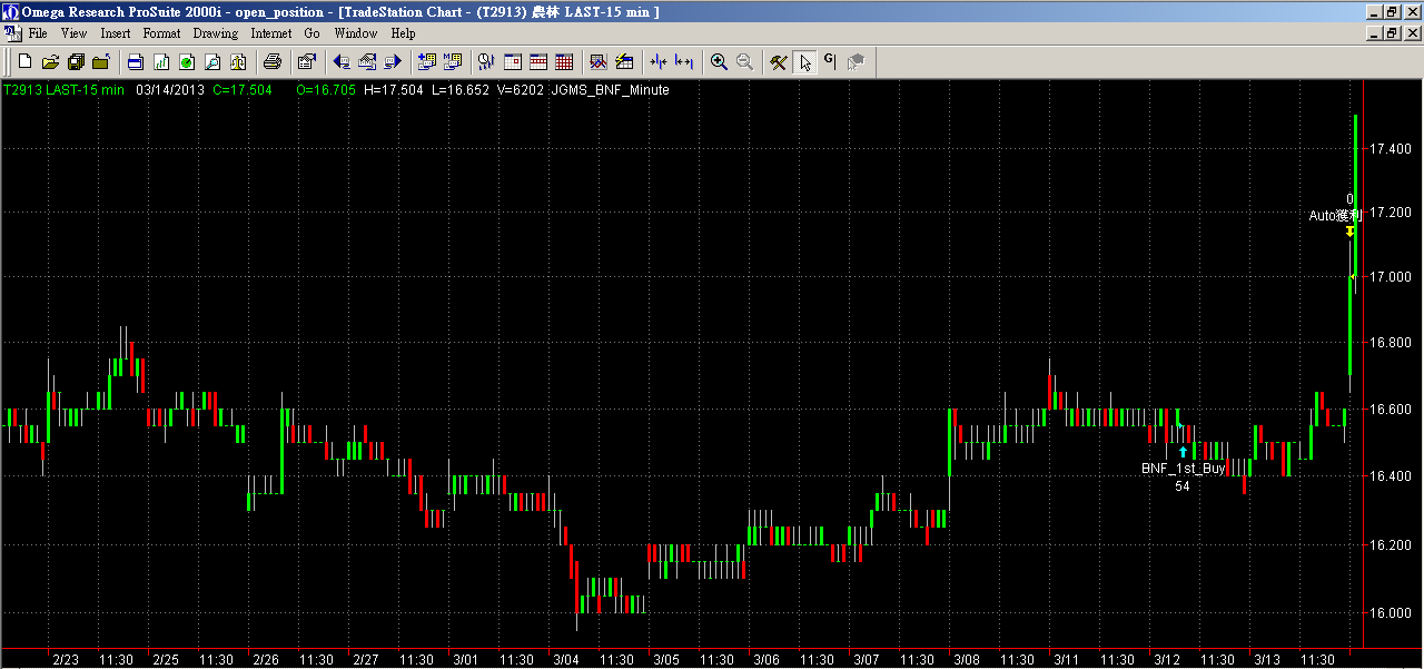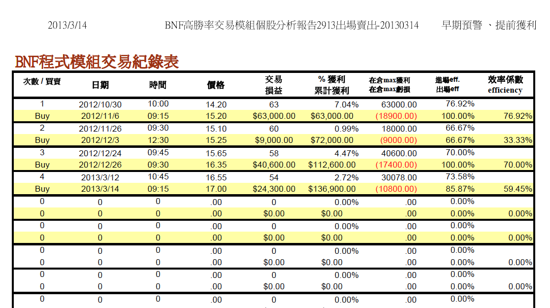 ★3/14日,投資教練的盤中即時高勝率BNF交易模組訊號,2913農林在當日盤中09:30左右發出出場賣出訊號,該股之前於3/12日在「聚寶盆籌碼智慧選股」看多模組排名上升,由BNF高勝率程式監控發出進場買進訊號(16.55元),目前程式發出訊號已賣出獲利出場(出場價17.1元,目前17.5元),提醒您,程式賣出獲利不代表看空,只是模組本身設定時間或是價位符合條件出場功能,BNF模組設計主要功能是要提醒早期發現波段進場訊號,未來該股仍可能整理之後上漲,但也可能持續整理一段時間,以下請參考「BNF高勝率交易模組個股分析報告2913出場賣出-20130314」之內容