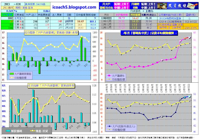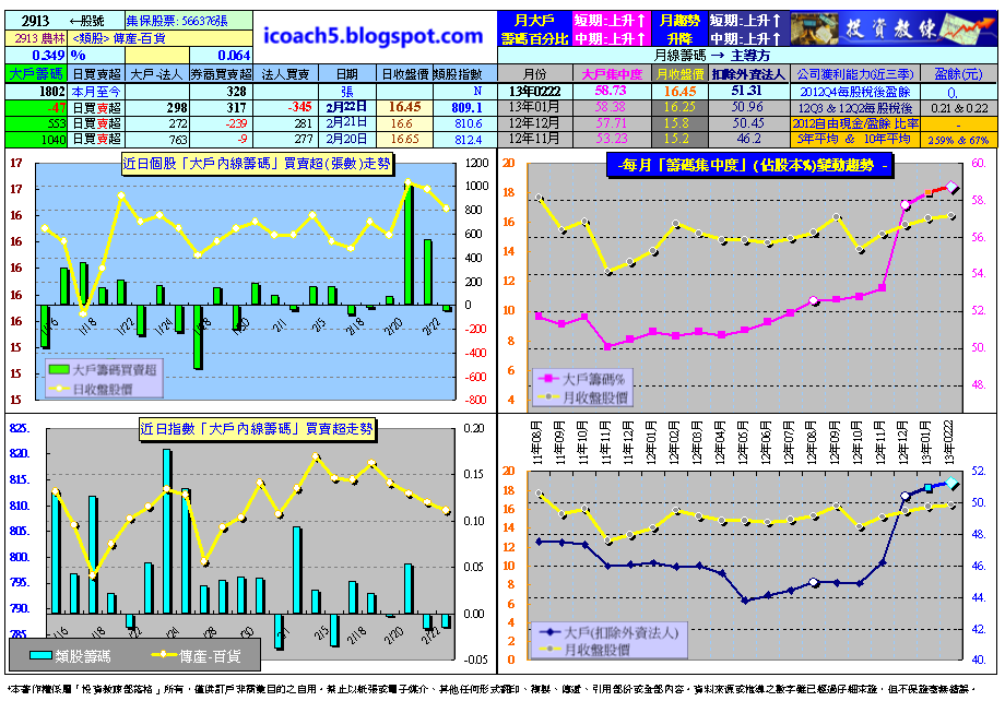 在此說明,分享版試看網站http://icoach5.blogspot.com的資料會delay〝底類〞若干天(以維護付費會員權益),1300多檔股票跟大盤整合的大戶進出動向,跟日線波浪走勢圖,都可以隨時查詢參考,平均一檔一個月不到1塊錢,簡直是太划算了。