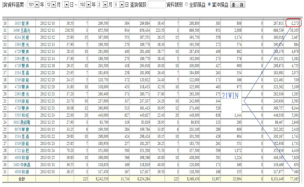 林書豪所屬的火箭隊,今天投進23顆3分球,追平NBA紀錄。投資教練不斷鑽研股市專業操作的技術,之前最高紀錄是當沖股票連贏30檔,如今,2013年初至今,漸漸的已經達到21連勝了,至於有沒有機會突破紀錄,其實這樣的100%勝率不是我們唯一要追求的,要強調的是,在一定的股市技術分析基礎上,配合『大戶內線籌碼』的資訊,將可大大提高贏錢獲勝的機率,至於會不會破紀錄?是另一回事了。