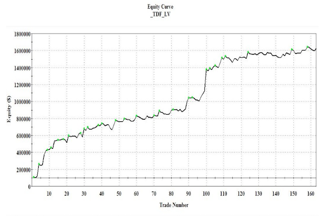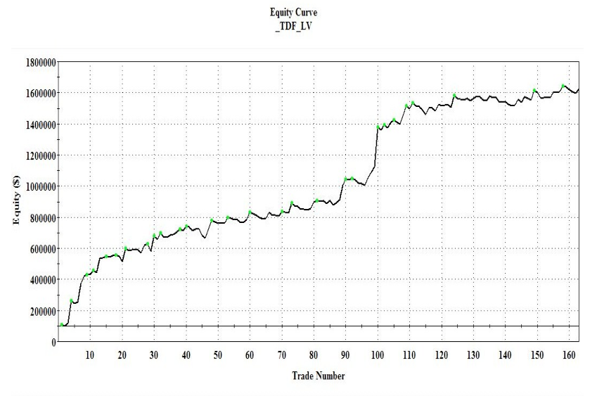 設計邏輯—大盤的K線有其連續性,因此從大盤的DATA來研發波段模組,而且是程式碼僅僅簡單化的四行,近一年半以來實測績效表如下,回測四年的績效表,近期仍在亮綠點(績效創新高),運用上則是搭配聚寶盆籌碼選股模組,當LV為買訊,買多股模組的股票贏面更大,反之亦然。