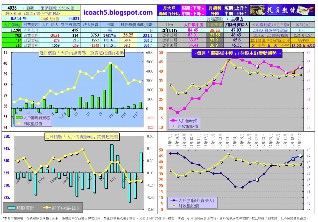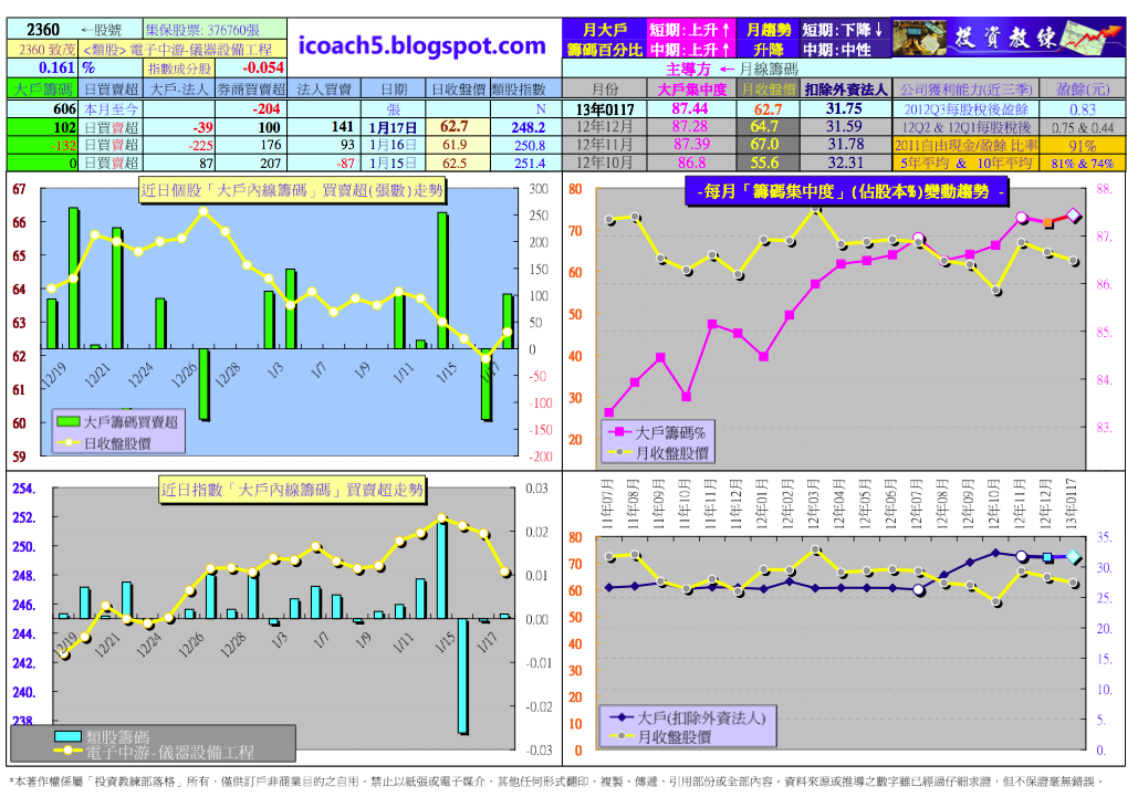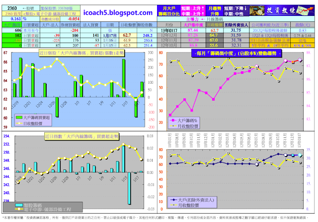 在此說明,分享版試看網站http://icoach5.blogspot.com的資料會delay〝底類〞若干天(以維護付費會員權益),1300多檔股票跟大盤整合的大戶進出動向,跟日線波浪走勢圖,都可以隨時查詢參考,平均一檔一個月不到1塊錢,簡直是太划算了。