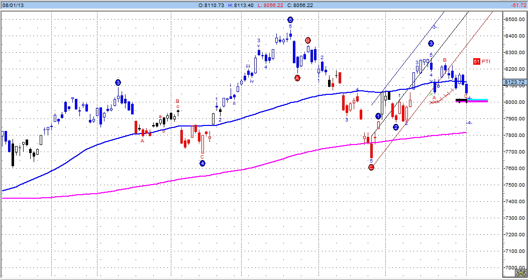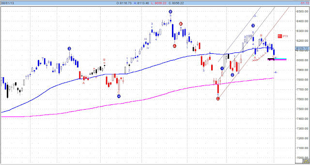 搭配日線波浪圖來看(見下下圖),8439點是第5波高點,之後ABC波回檔,恩,教科書上的波浪理論是12345之後ABC,沒錯,然後又出現新的波浪結構,目前是第4波回檔修正,而波浪鐵板支撐帶在8020點,看來有可能第4波見低點要彈第5波了。