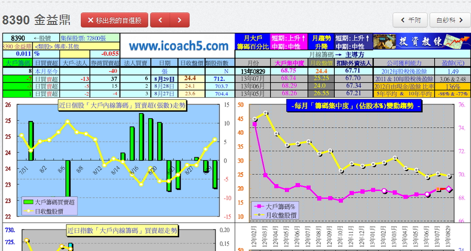 金益鼎8390 黃金價格經過21個月的回檔修正跌到1200點,自6月份落底,目前已經站上1400元,此時就可以選擇相關股票,如貴金屬回收的金益鼎,股價低點23元,最近隨著大盤反彈到24元,跟黃金的連動係數就偏低,再檢視個股大戶籌碼,集中度中性偏多,沒有像上面那檔這樣的主力大戶勞跑了,就可以天天追蹤主力大戶動向,在股市要賺錢,還是靠自己做功課吧!