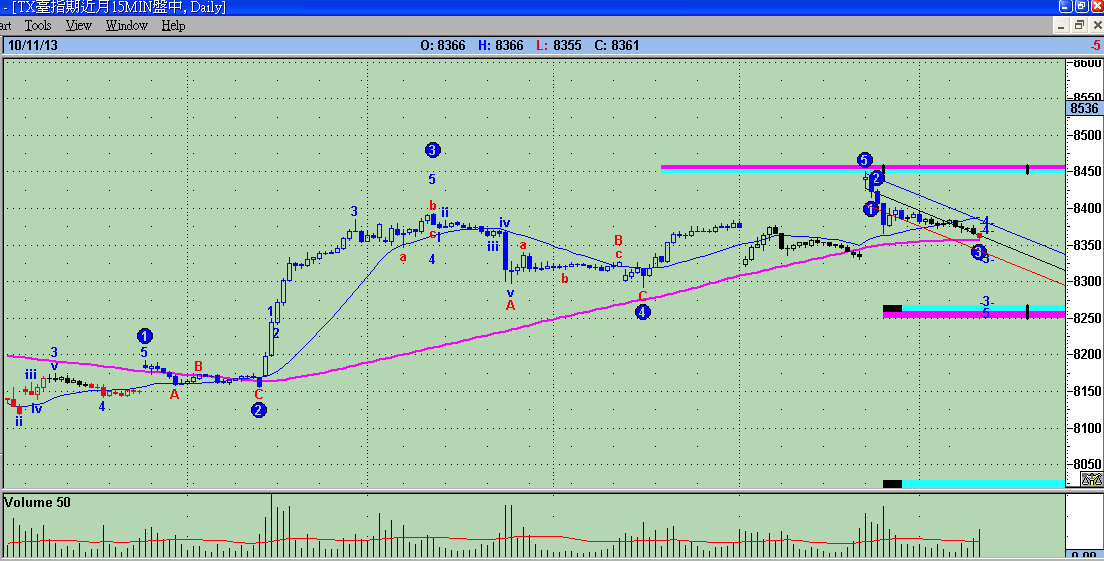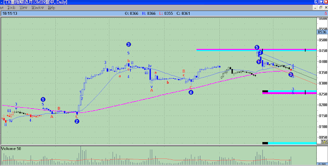上週四國慶日休市,這兩天道瓊共漲了350點,也激勵上週五台股開高反應,但是,事情就是這麼巧,從每天的盤前文可見的上檔波浪鐵板壓力帶8450點,就剛好是當天台指期最高點,隨後一路下殺,到今日最低8273點,又剛好碰觸下檔波浪短線支撐,一度反彈70點。