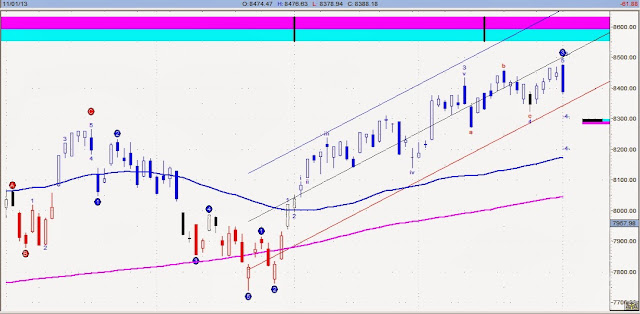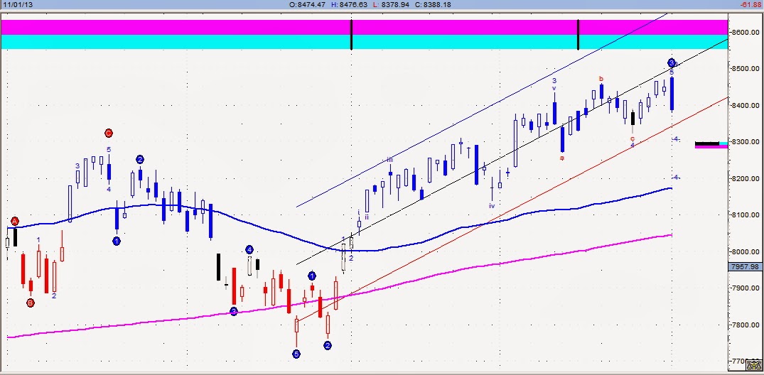大盤日線波浪圖來看,第三波上漲的上升軌道區間已跌破,在整體大戶籌碼持續賣方情況下,很可能開始第四波回檔整理,配合主筆室之上海A股的連動看法,整理期不是3天、5天,而是長達1.5個月到2個月,中短線保守,減量經營為宜,或是提前去過個聖誕假期。