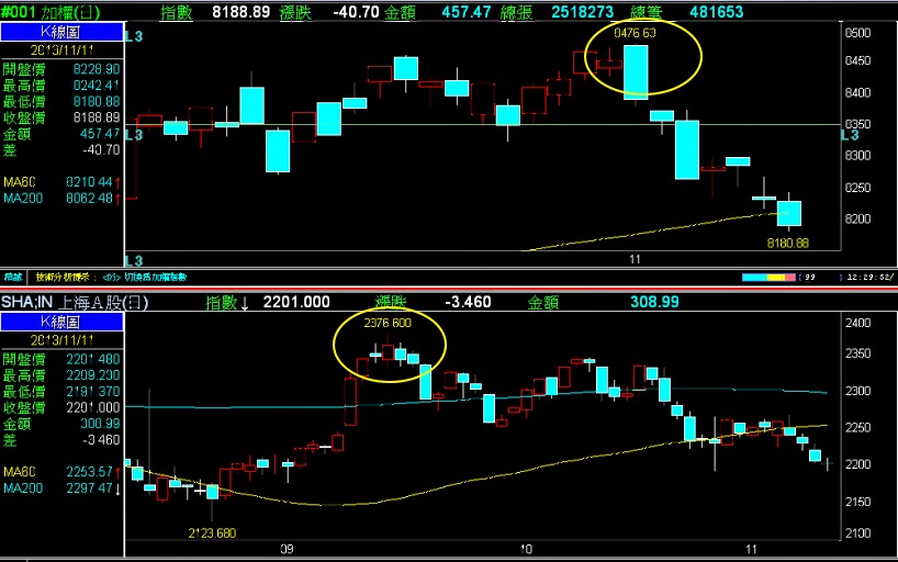 上海A股在九月中自2376點開始下跌修正,最低2190點,至今仍處破底邊緣,而台股與上海A股常有的連動效應,台股約落後上海A股1.5-2個月,此波台股自11月初的8476點開始下跌,目前為止,台股走勢可真是〝一模一樣〞,如此一來,台股可能走的是ABC小波下跌,目前為A小波下跌,雖然短線有B小波反彈的機會,但空間有限,未來仍要提防C小波下跌,則至少在聖誕節前,對台股維持保守態度。