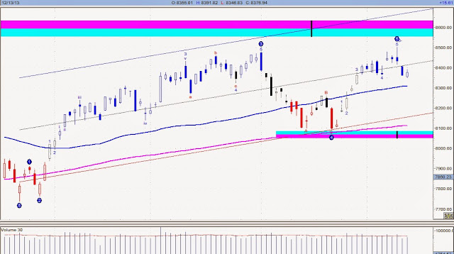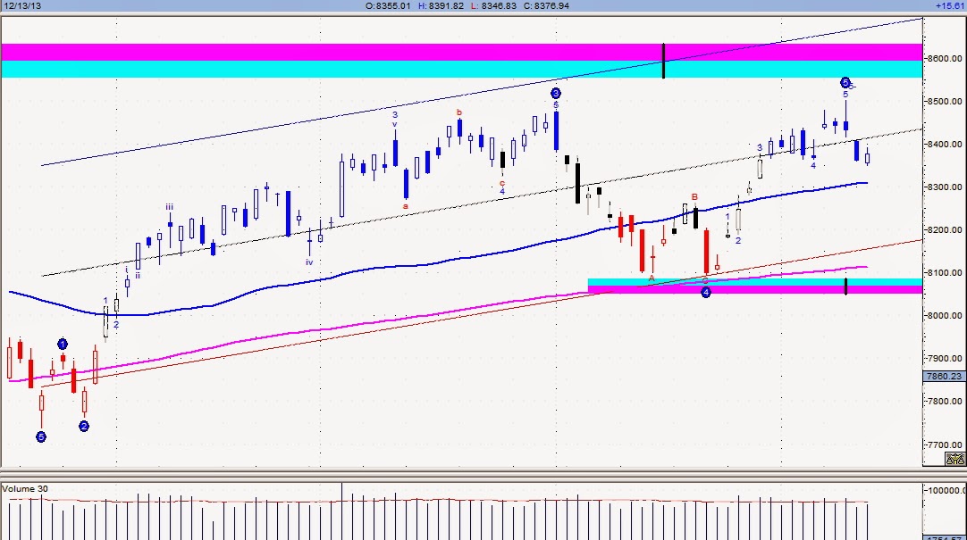 台指期分時波浪出現向下5波修正,從下圖可見,目前走的是第5小波修正,下檔波浪支撐帶8330,今日低點已然碰觸,至於是否會開始彈升?老話一句,請大家晚上九點到網站觀看最新整體大戶籌碼動向,若有連續翻多跡象,則年底行情的彈升就比較有希望。